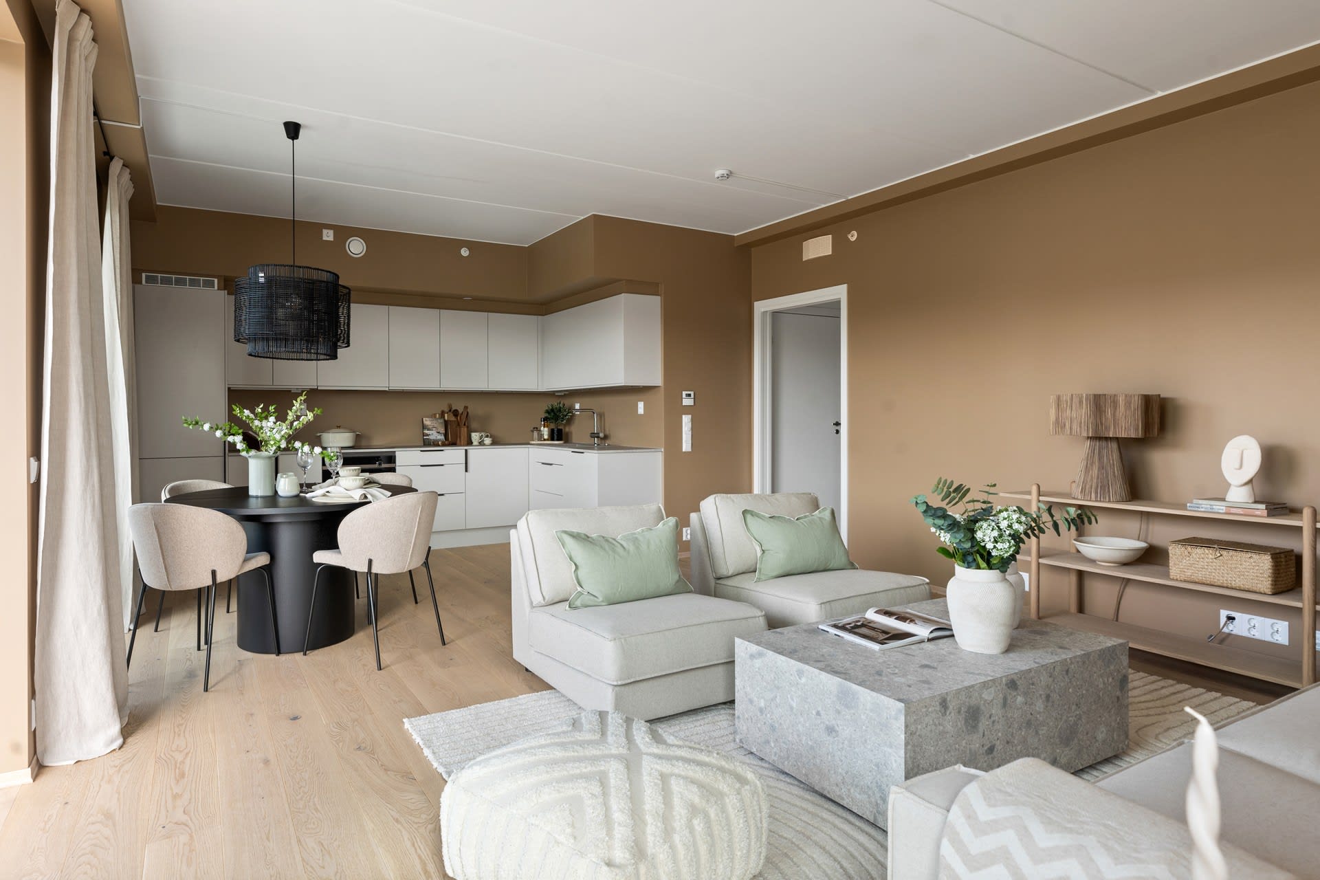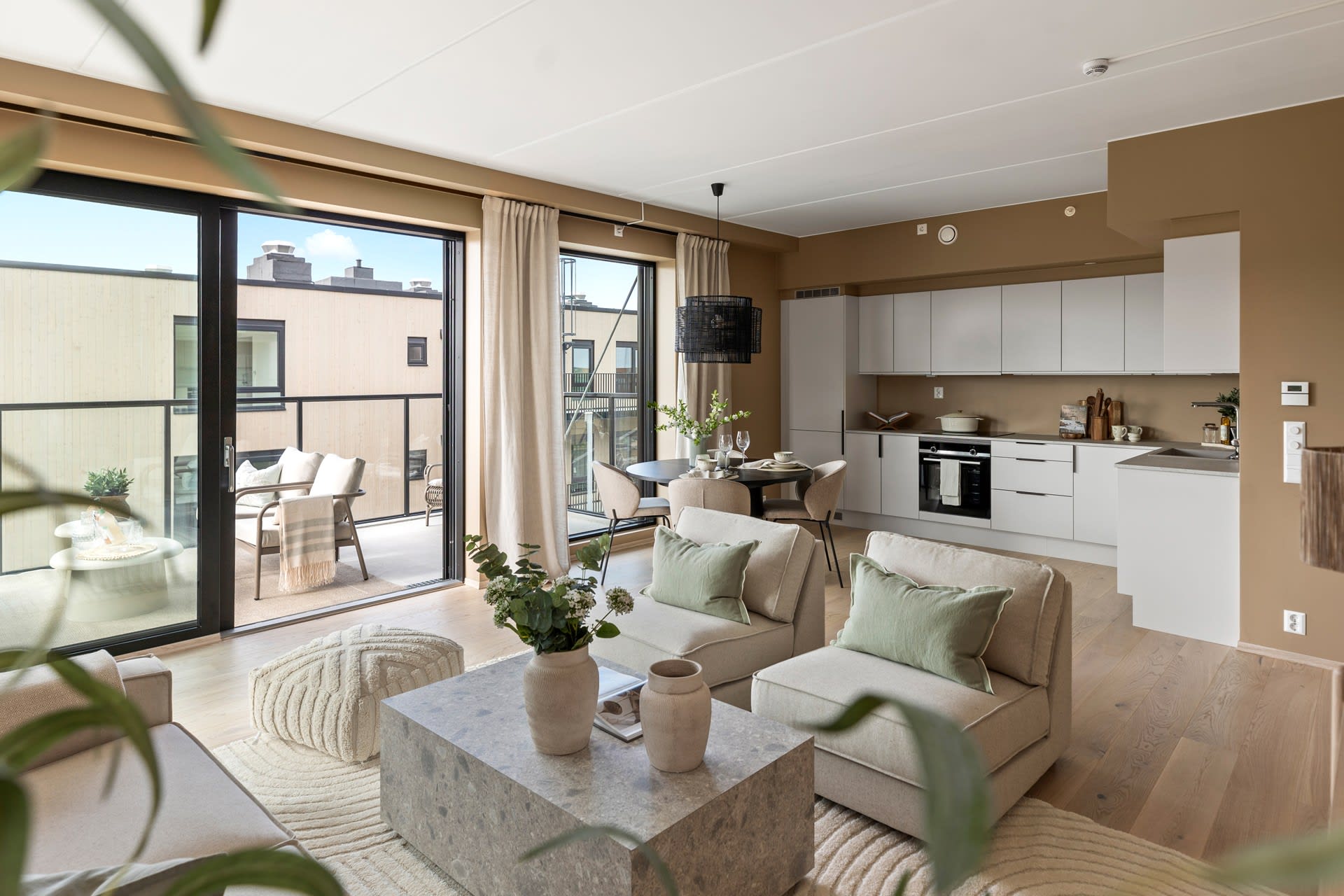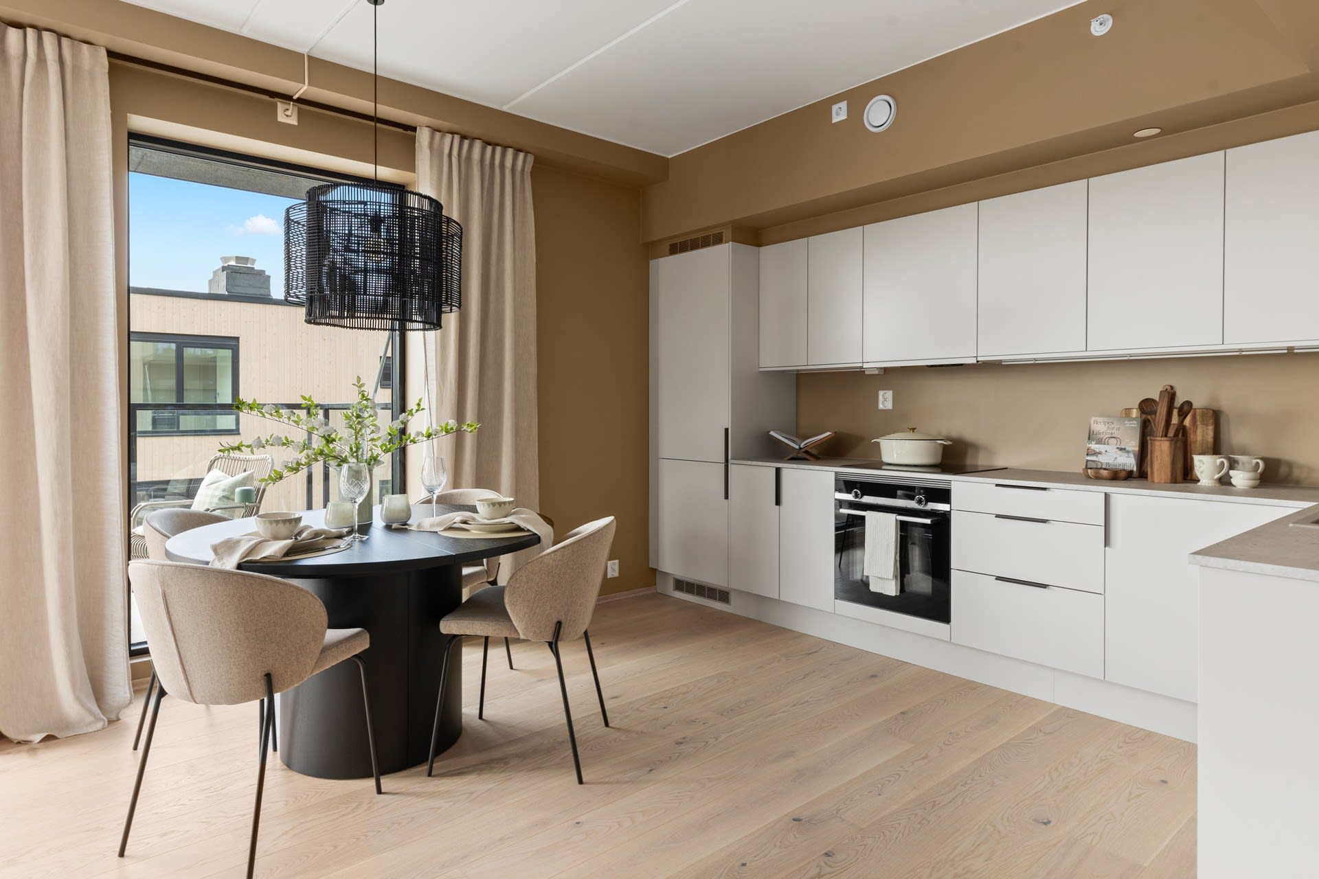 mot øst. Lys og luftig kjøkken-/stueløsning med vindusflater