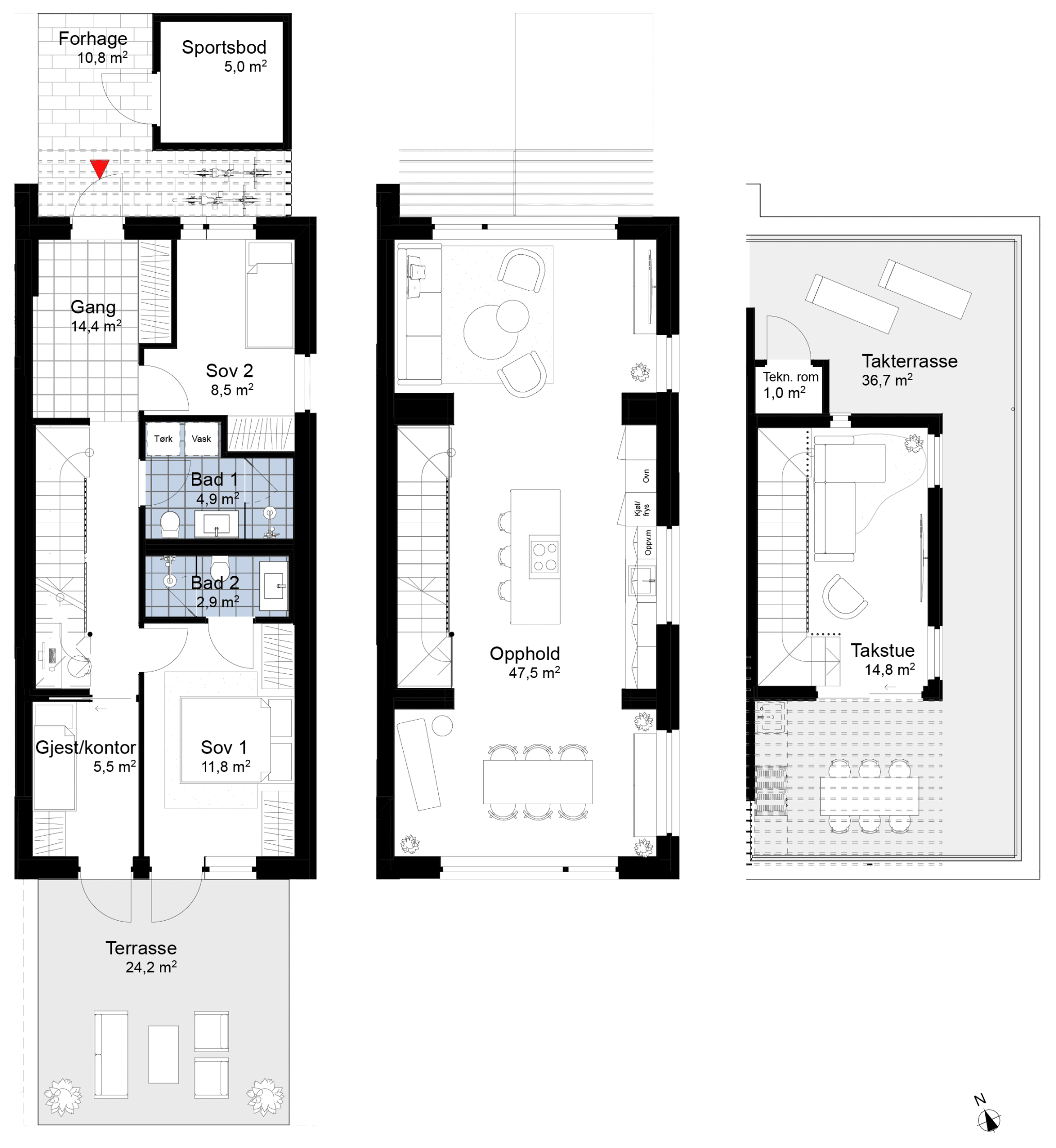som ligger midt på takhagen. Soveavdeling i første etasje.