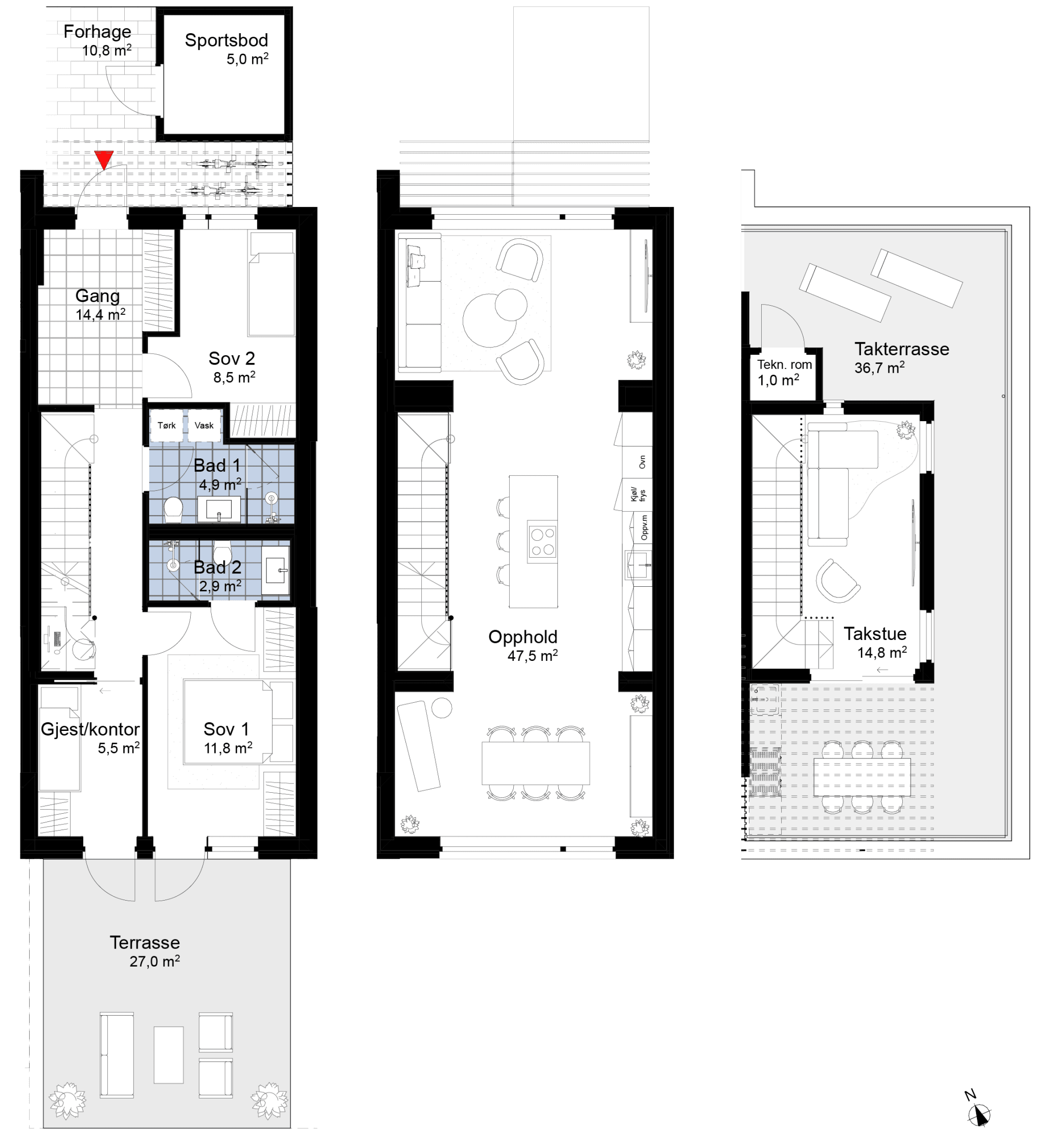 som ligger skjermet i sørvestre enden av takhagen. Soveavdeling