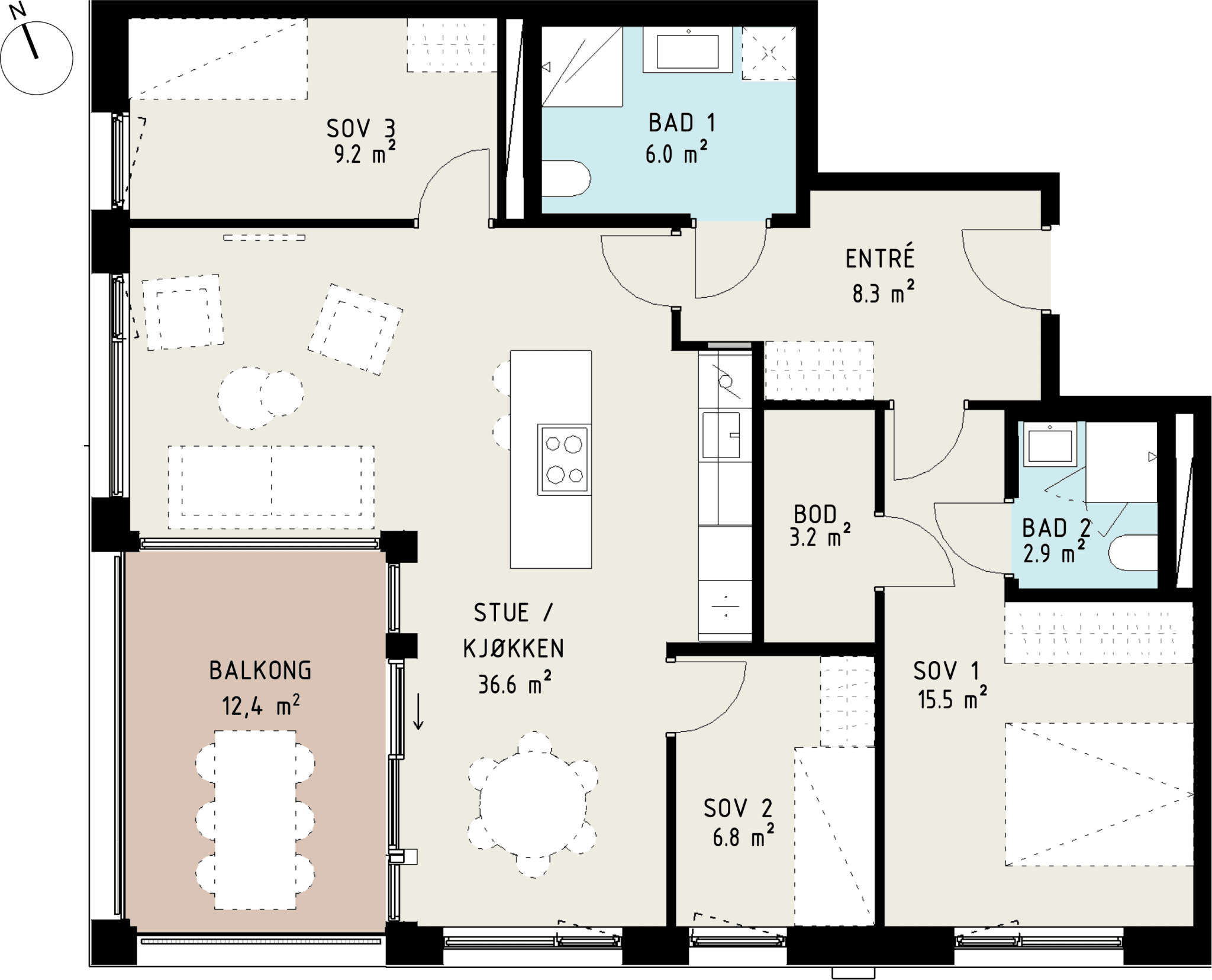 Denne leiligheten har mulighet for alternativ planløsning som 3-roms. Klikk på knappen under for å se annen løsning