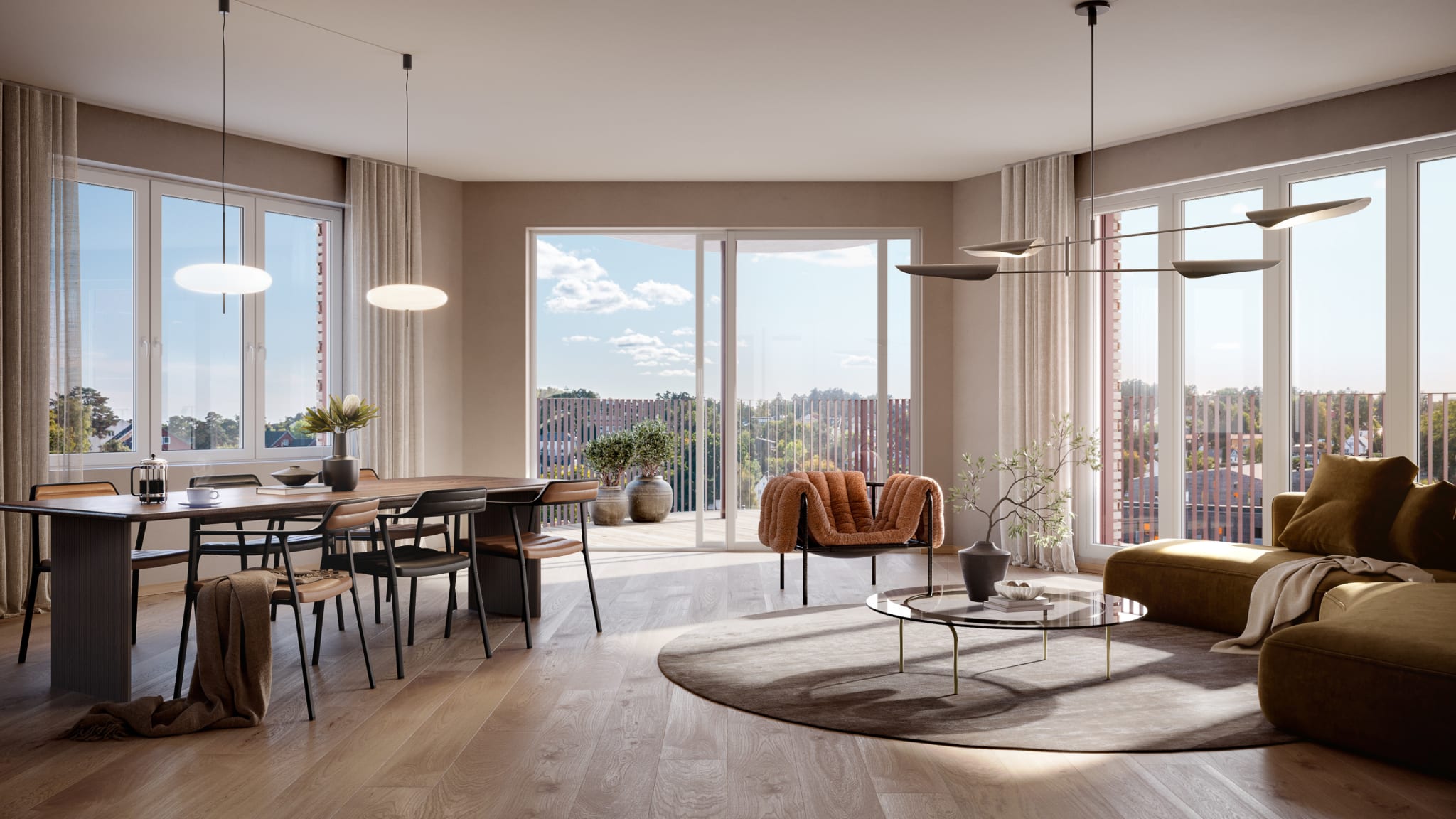 I Tårnene på Værstetorvet bor du ved foten av gangbroa, kun en heistur unna der det skjer. Her kan du trekke deg tilbake og nyte livet på takhagen eller finne roen på din private balkong. Illustrasjon – avvik kan forekomme.