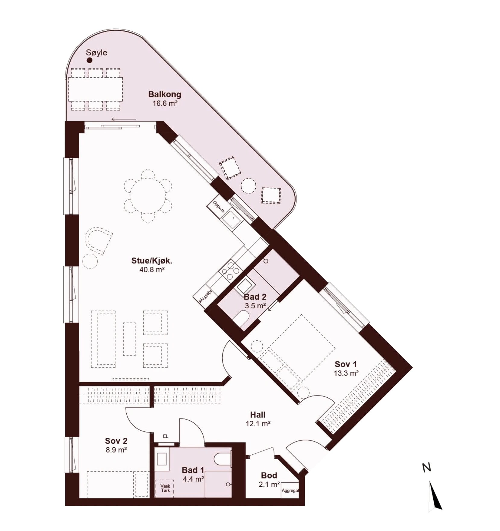 Leilighetene er i ulike størrelser og prisklasser; 4-roms, 3-roms og 2-roms. I tillegg til din egen private balkong, har du en stor takhage å boltre deg på. Se noen eksempler på ledige leiligheter her (trykk på leilighetsnummeret for å se leilighetens egne side i boligvelgeren):