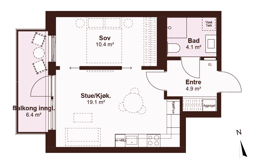 Arealeffektiv 2-roms i 6.etasje med innglasset balkong på 6,4 kvm. Her får du en praktisk og urban bolig, med innglasset balkong som kan brukes året rundt.